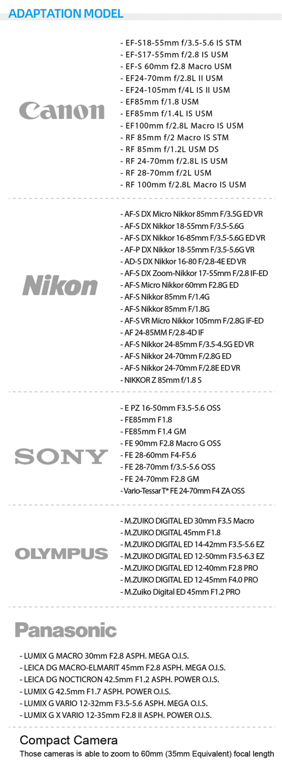 • Kompatybilne aparaty i obiektywy (rekomendacja): Rozmiar matrycy: 36mm x 24mm (pełna klatka) ,Obiektyw aparatu: 60mm (odpowiednik 35mm) – F/2.8