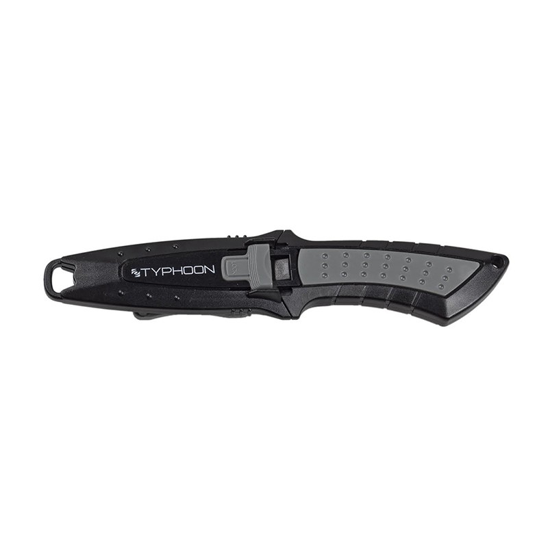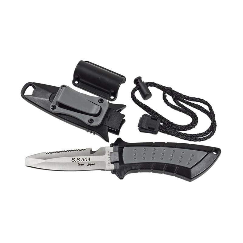 - Dwie krawędzie tnące (gładka i ząbkowana), oraz specjalne wgłębienie ułatwia przecinanie sieci, bez czubka dzięki czemu nie przedziurawi skafandra.